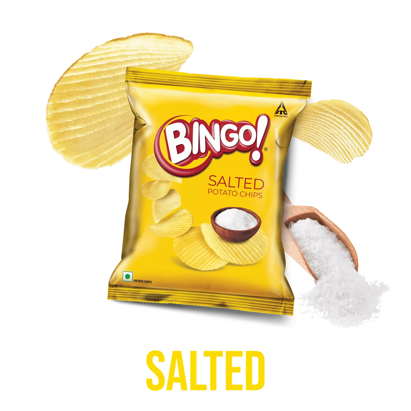 Enjoy the timeless taste of Bingo! Salted Potato Chips. Lightly salt chips, perfectly crispy, and always satisfying. A classic snack for every occasion!